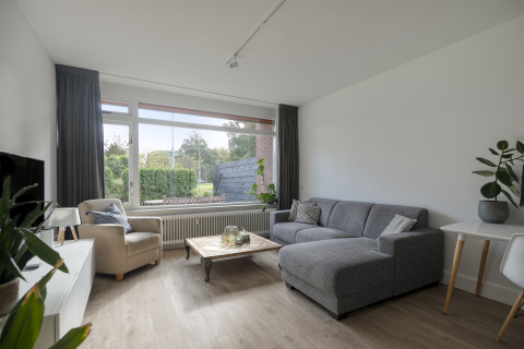 Bij binnenkomst via de voordeur komt u in de ruime hal met mooie glas in lood ramen, alwaar zich een garderobekast en een toilet bevinden. Vanuit de hal is er toegang tot de ruime woonkamer. Deze lichte en open ruimte loopt over in de eetkamer aan de achterzijde van de woning, met uitzicht op de tuin.